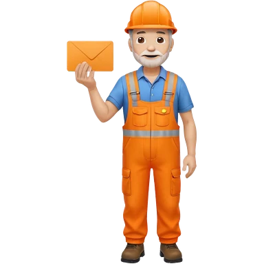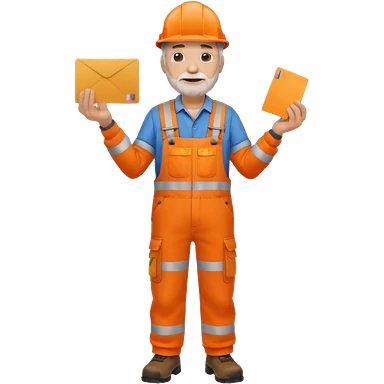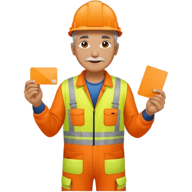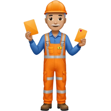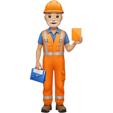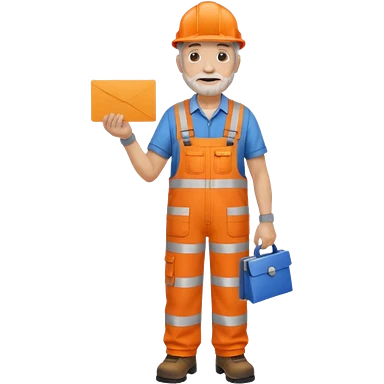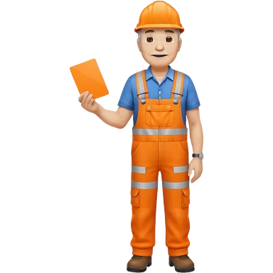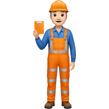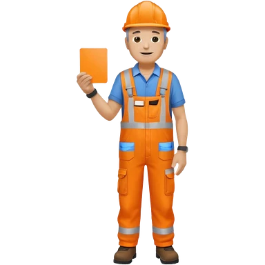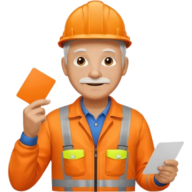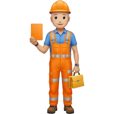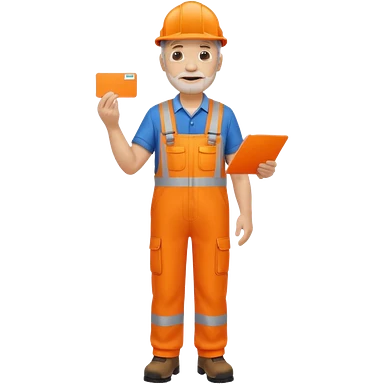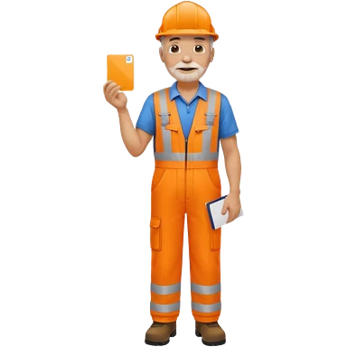older engineer hi-vis orange overalls standing full body holding a card emoji