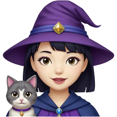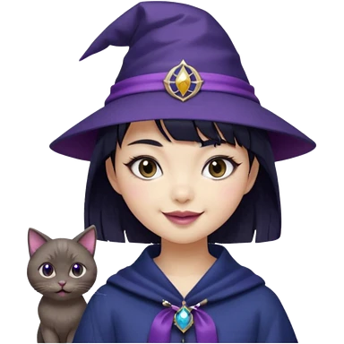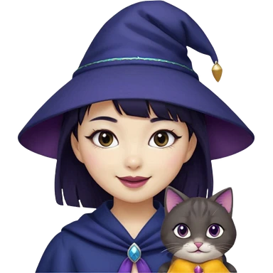 An Asian short-haired girl with short raven hair and bangs, with heterochromia eyes(her left eye is silver coloured and her right eye is dark brown coloured), cat-eyed eyeliner, and laughs with a tiny fang of mauve-toned lipstick, wears a dark navy wizard hat with an emblem on it. emoji