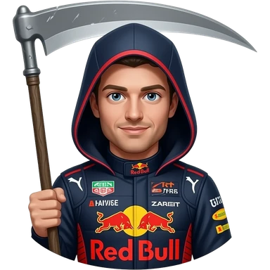 Max verstappen as grim reaper wearing a red bull race suit with grim reaper weapon emoji