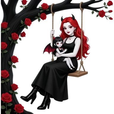 Vampiro adolescente femmina con pelle bianca e capelli rosso ondulati lunghi che indossa una gonna lunga nera e un top-canottiera nera e degli stivali lunghi neri con tacco e che dondola su un altalena attaccata a un albero nero con rose rosse con in braccio una bambina VAMPIRA con pelle chiara emoji