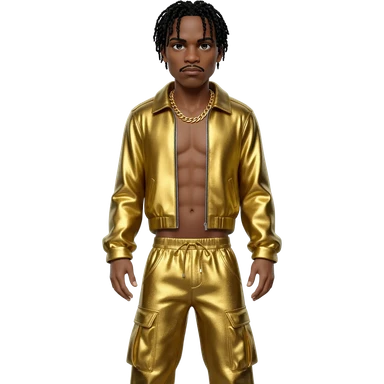 MC Hammer with black hair, gold metallic jacket, gold metallic harem pants, shirtless with necklace emoji | AI Emoji Generator
