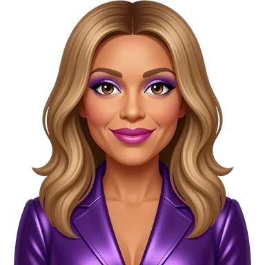 Wendy Williams with brown eyes, long golden brown hair, purple eyeshadow, hot pink lipstick, purple metallic outfit emoji