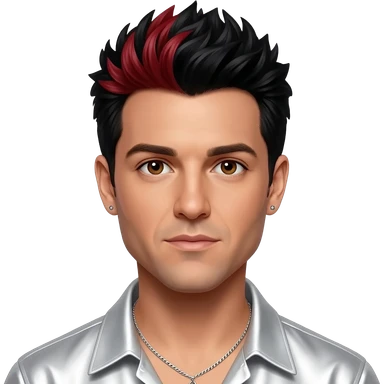 AJ McLean from Backstreet Boys with brown eyes, black hair with red highlights, white metallic shirt silver necklace with short earrings emoji