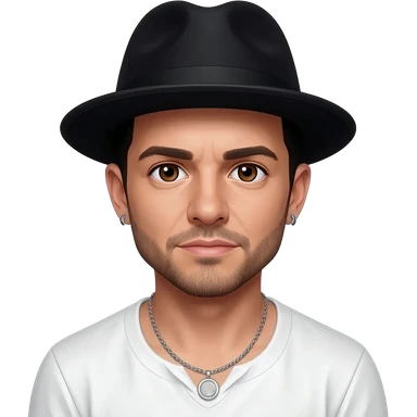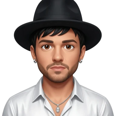 AJ McLean from Backstreet Boys with brown eyes, black hair and short beard, black hat, white metallic shirt silver necklace with short earrings emoji
