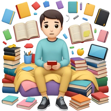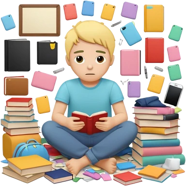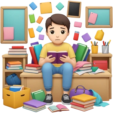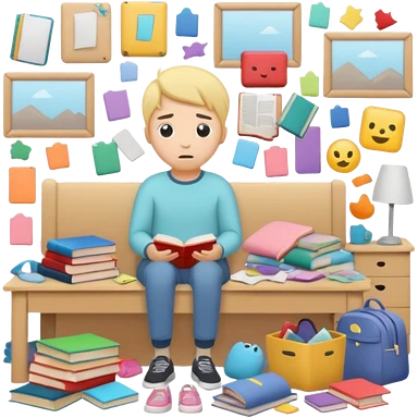 messy room with scattered objects, clothes and books everywhere, simplified human character looking slightly overwhelmed but safe, everyday chaos, flat custom emoji sticker, pastel colors, rounded shapes, minimal details, thick outline, white background, no text emoji