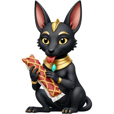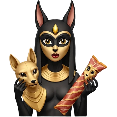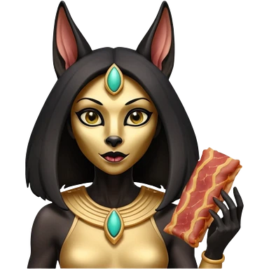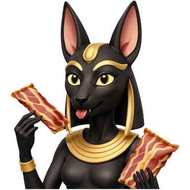 mean Short-eared Black fur beautiful female alien anubis statue posed biting on bacon packaging emoji