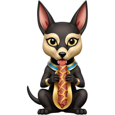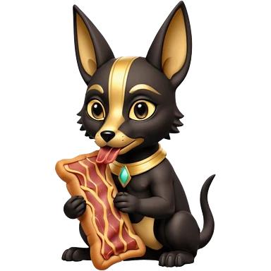 mean Short-eared Black fur beautiful female alien anubis puppy statue posed biting on bacon packaging emoji