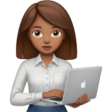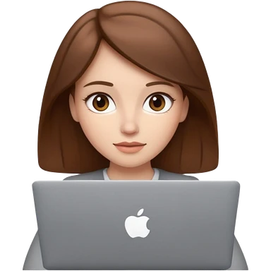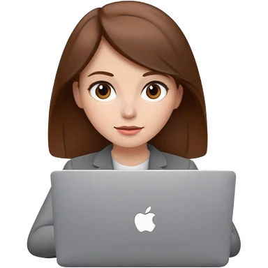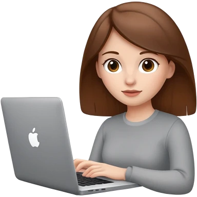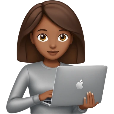 memoji of a brown hair female with a grey laptop in front, apple-style, modern emoji