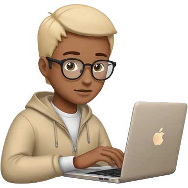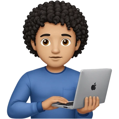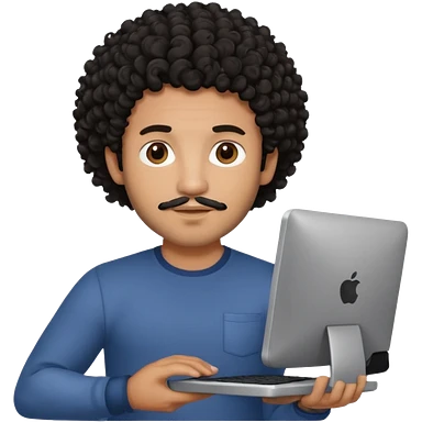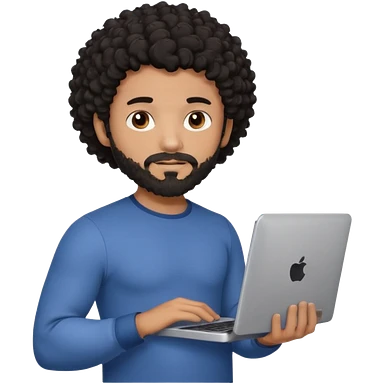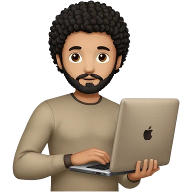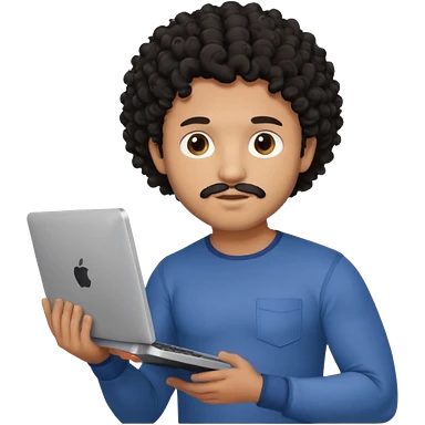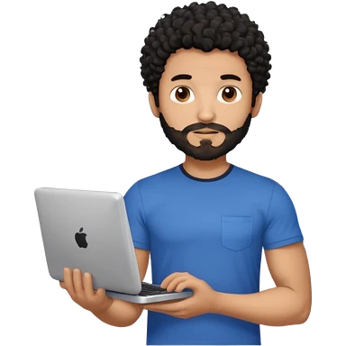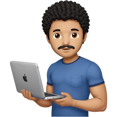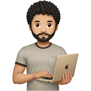 men holding his computer in hands. light brown skin men with curly black hair, dark brown eyes, little grown beard. ust a tiny bit muscular. dressed casual. round face. emoji