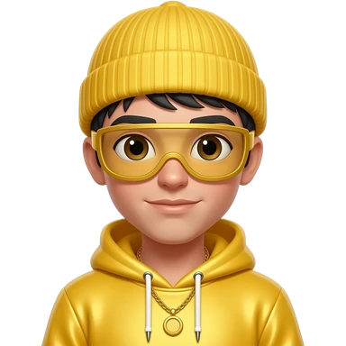 Ali G from Fictional Characters with white skin, brown eyes, black hair, yellow beanie, yellow goggles, yellow metallic sweatshirt, gold necklace emoji
