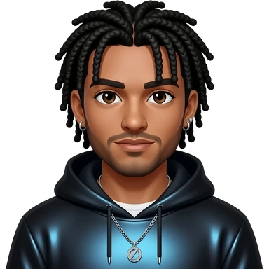 Hassan B from Fictional Characters with dark brown eyes, long black cornrows, black and blue metallic sweatshirt, silver necklace and earrings emoji