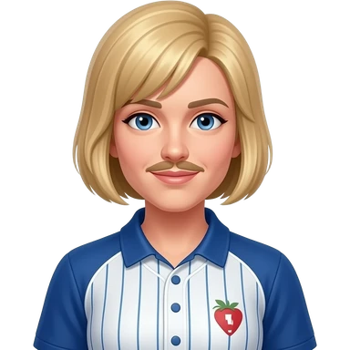 Coach Heider from Fictional Characters with dark blue eyes, strawberry blonde short bang hair and thin mustache, blue and white metallic baseball polo shirt emoji