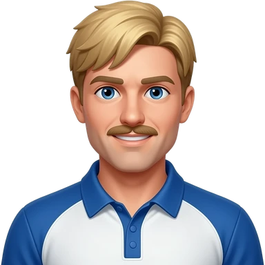 Coach Heider (Male) from Fictional Characters with dark blue eyes, strawberry blonde short bang hair and thin mustache, blue and white metallic baseball polo shirt emoji