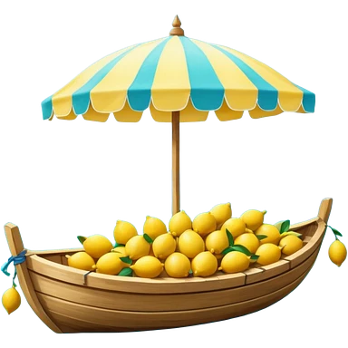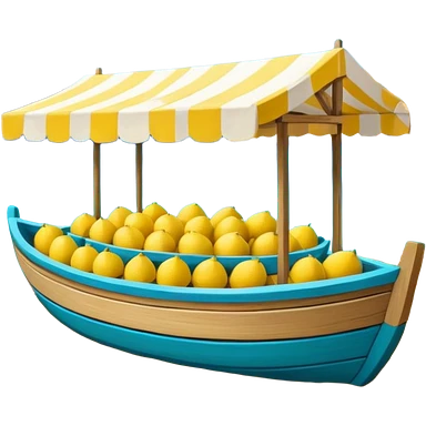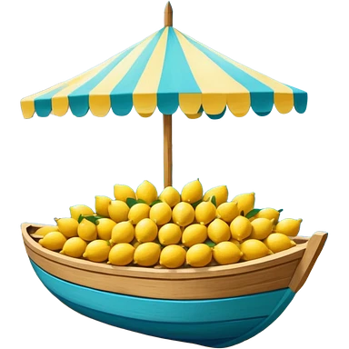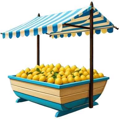 Mediterranean lemon stand by the sea, blue and white striped canopy Fresh yellow lemons stacked, wooden boats and turquoise water background Bright sunlight, Italian coastal summer vibe, vibrant colors emoji