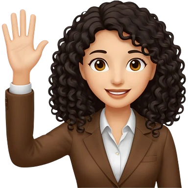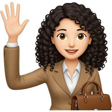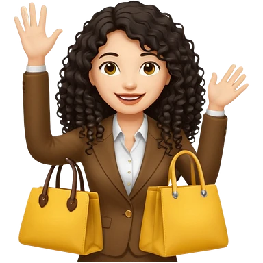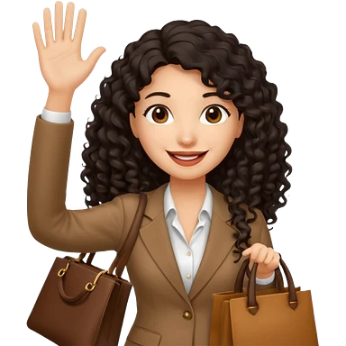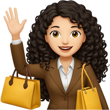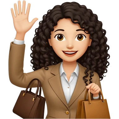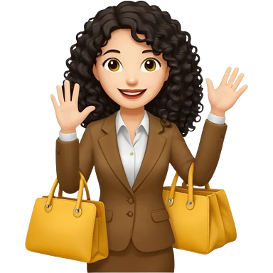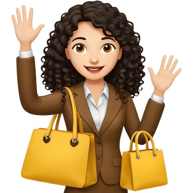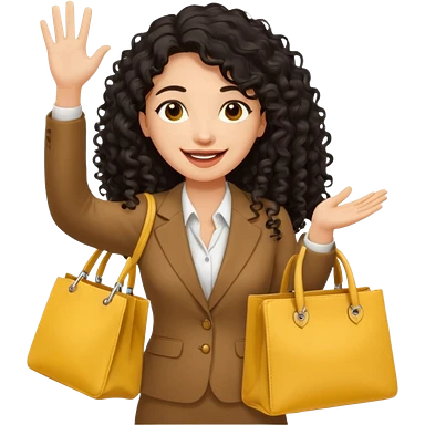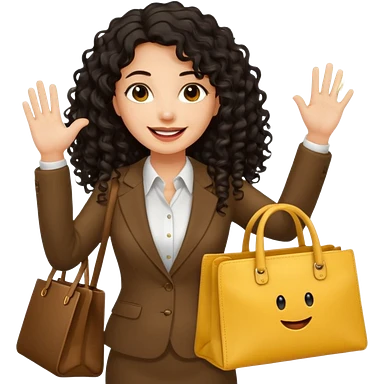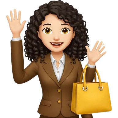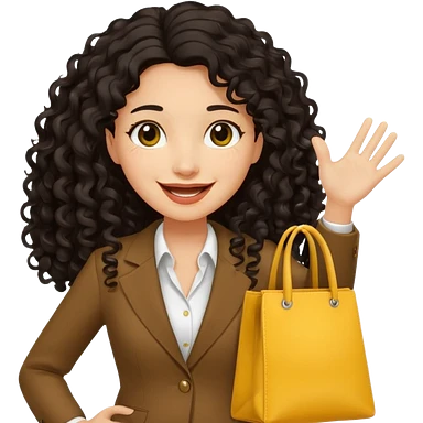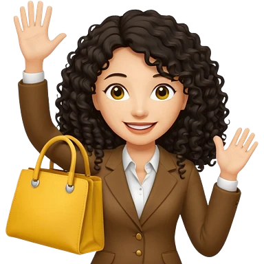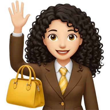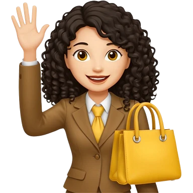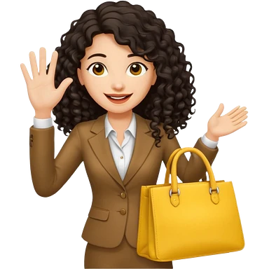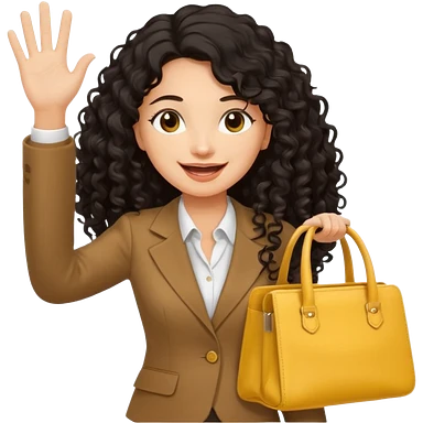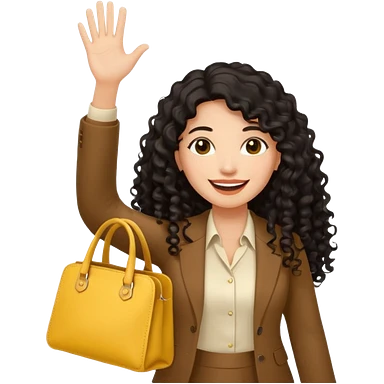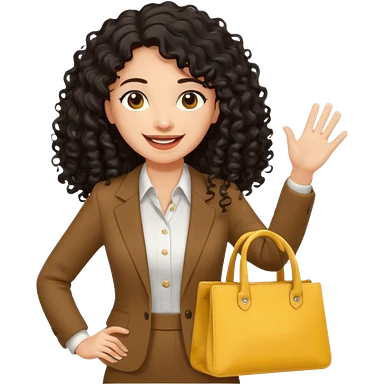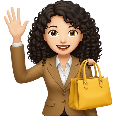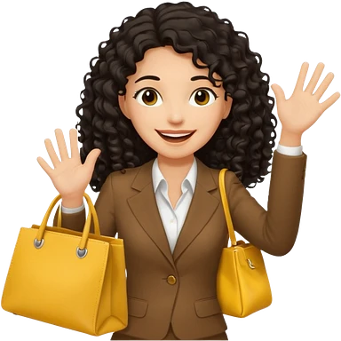 medium deep tan brown business woman with long black curly hair, waving hand with happy face with smile mouth and carrying yellow bag on her shoulder emoji