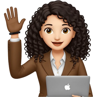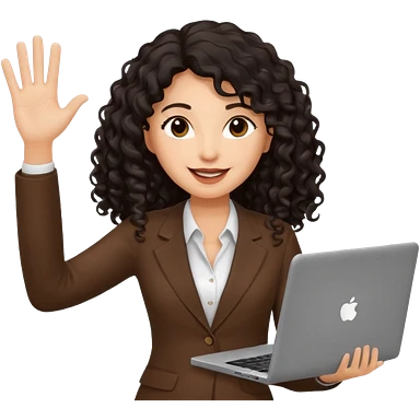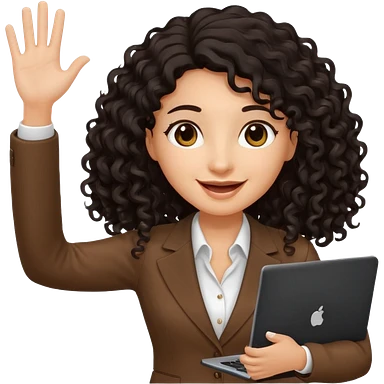 medium deep tan brown business woman with long black curly hair, waving hand with happy face and holding a laptop emoji