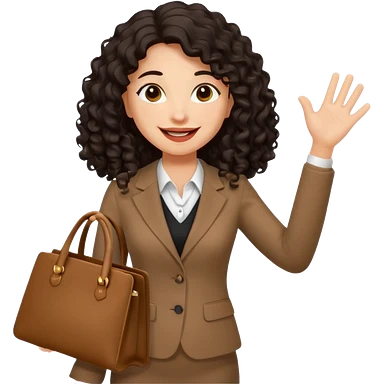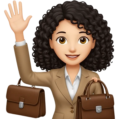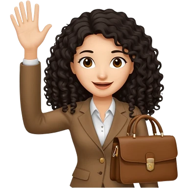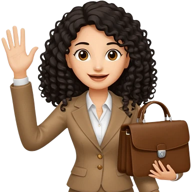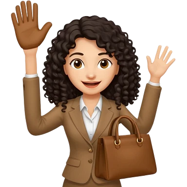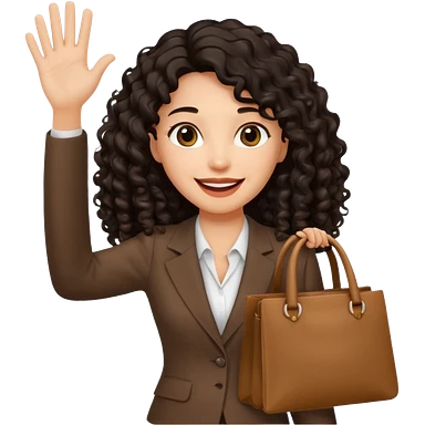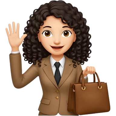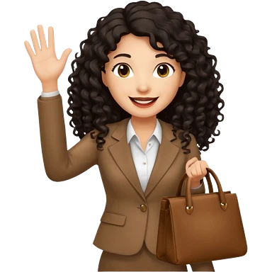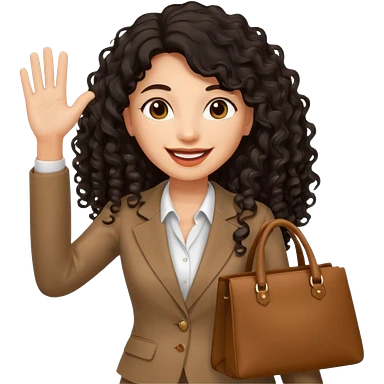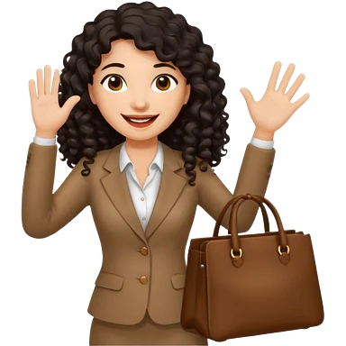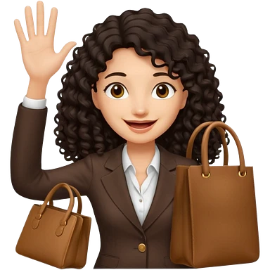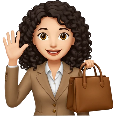 medium deep tan brown business woman with long black curly hair, waving hand with happy face with smile mouth and carrying bag on her shoulder emoji