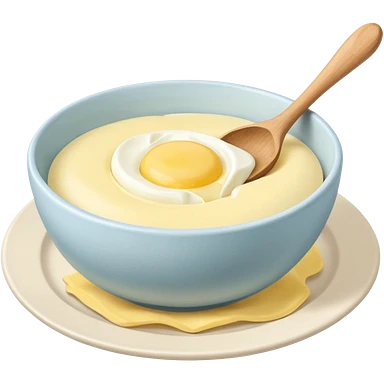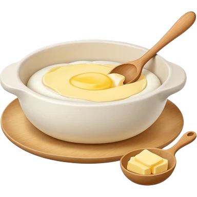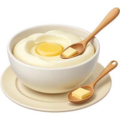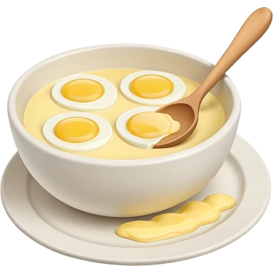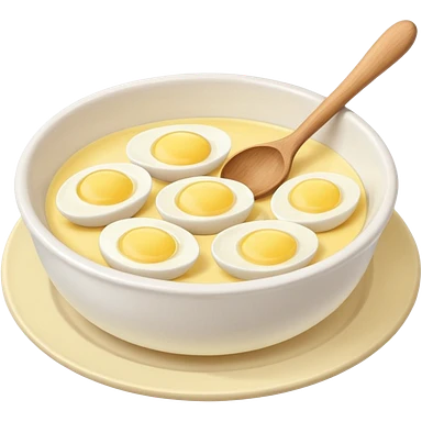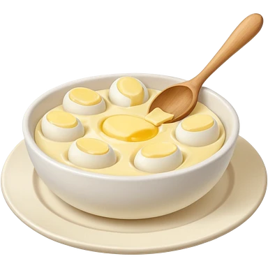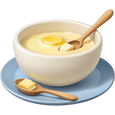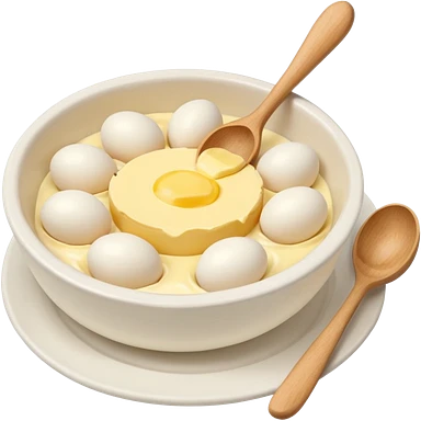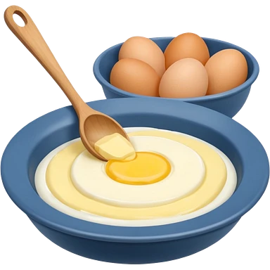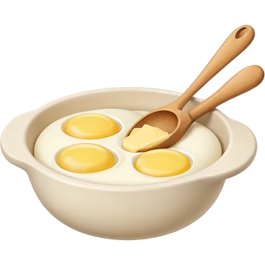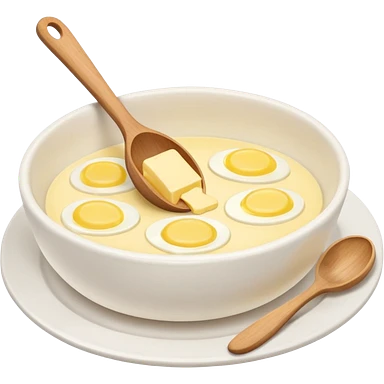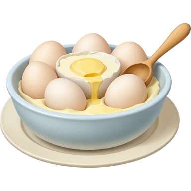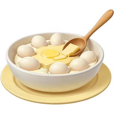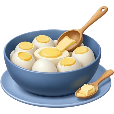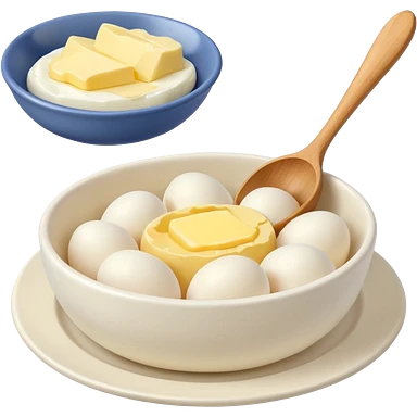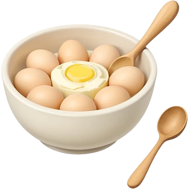 a dozen eggs, a ceramic mixing bowl with a wooden spoon and a plate of butter emoji