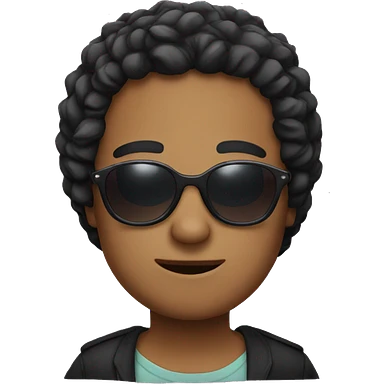 A face of girl with black long hair, wearing sunglasses and a blue t-shirt.She's grinning.She's winking at me. emoji
