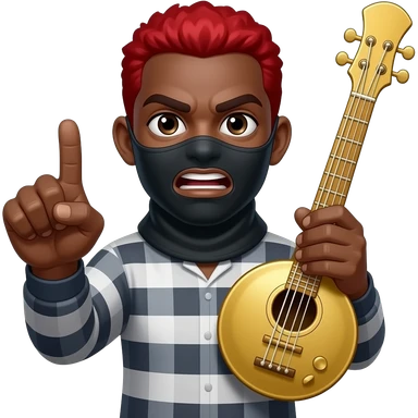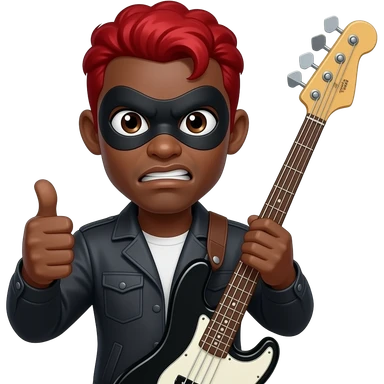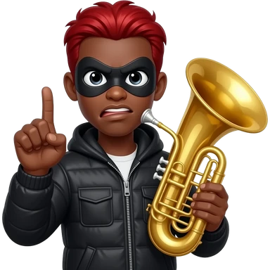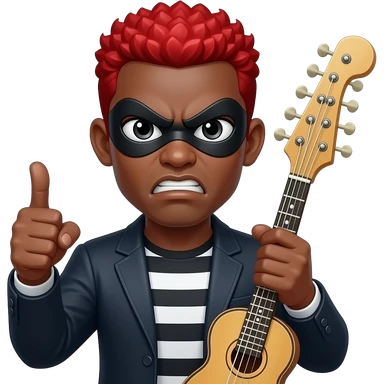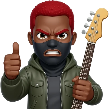 give me a black-skinned guy emoji who's showing with his thumb that everything fine, also on the other hand he holds a jumbo instrument he should have red hair, his eyes should be small and wide his mouth should be mad and his eyes should be really small. on his head he should have the robber mask emoji