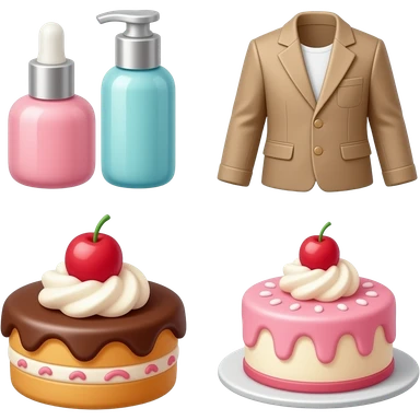 beauty products, stylish clothing, delicious desserts, skincare bottle, fashionable outfit, cake, ecommerce products for sale emoji