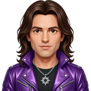 Jonathan Davis with brown eyes, long dark brown hair, purple metallic nu-metal outfit, necklace emoji