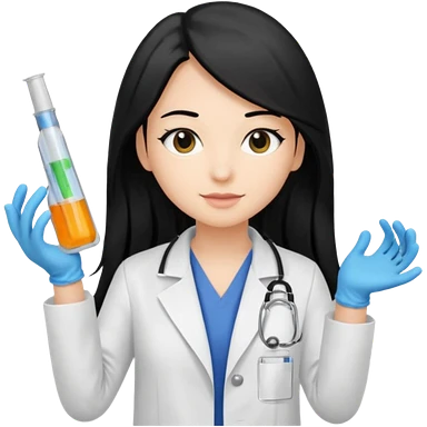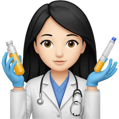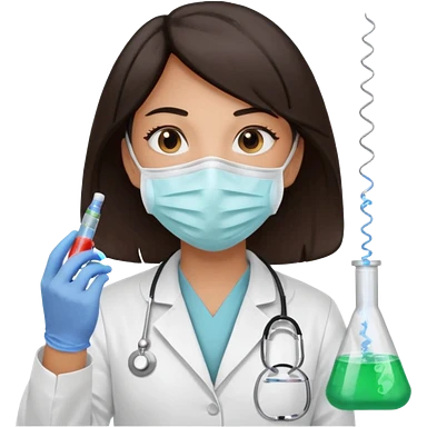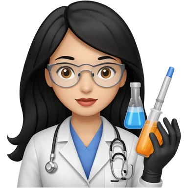 medica con guantes y mascarilla e insumos laboratorio jeringa tubos pelo negro largo triguella emoji