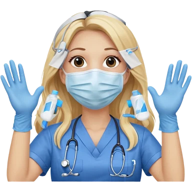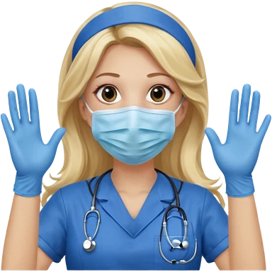 enfermera rubia con pelo largo, con mascarilla y guantes que aperezcan las dos manos emoji