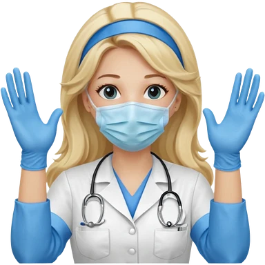 enfermera rubia con pelo largo sin balaca en el pelo, con mascarilla y guantes azules las dos manos arriba emoji
