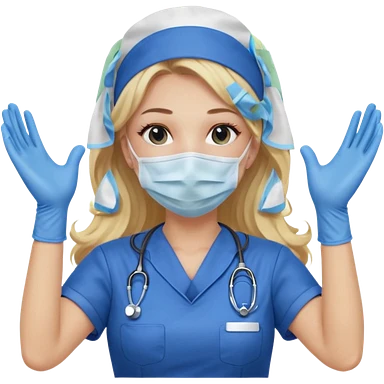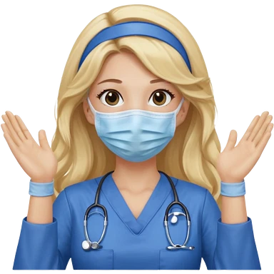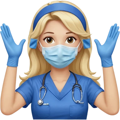 enfermera rubia con pelo largo sin balaca en el pelo, con mascarilla y guantes azules las dos manos arriba emoji