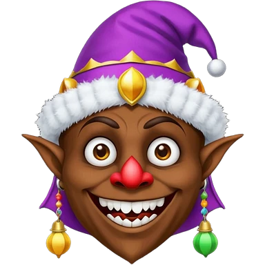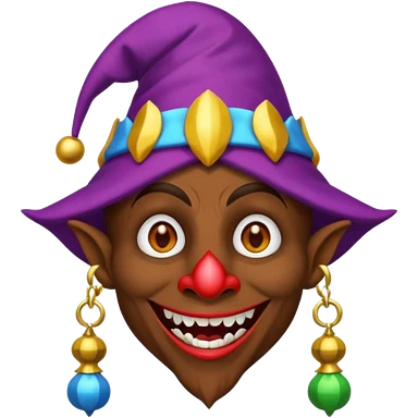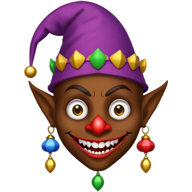 Dark brown skin medieval jester with white pupils and fangs emoji