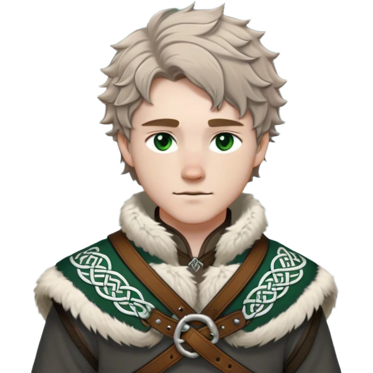 Medieval winter outfit worn by a DnD themed fantasy male character. Heavy charcoal wool tunic with arctic wolf fur lining, adorned with intricate iron clasps and a thick leather belt with celtic knotwork. Clothes only above the waist, full waist coverage. The character has no arms. Character is white-skinned with light brown hair, gray-green eyes, and short wavy hair dusted with winter's touch.emoji