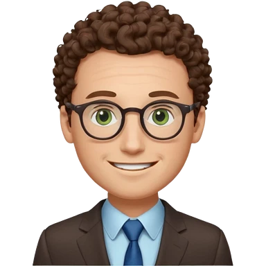 The face of a white man, with blue/green eyes, a large forehead, small and thin round glasses, curly brown hair, wearing a suit, and smiling emoji