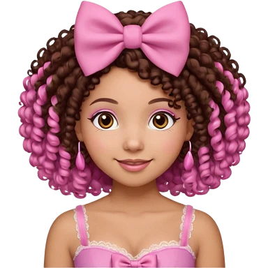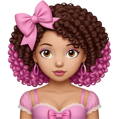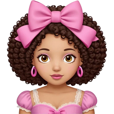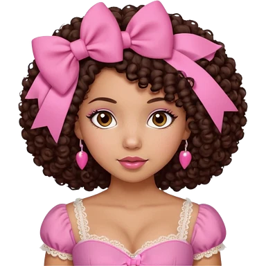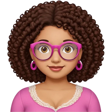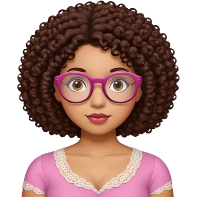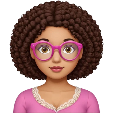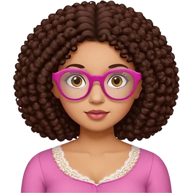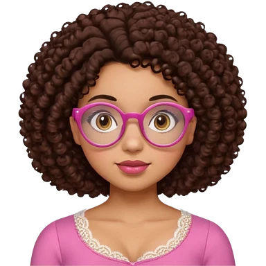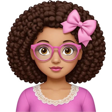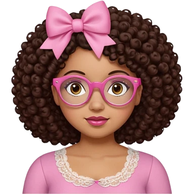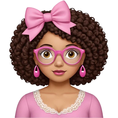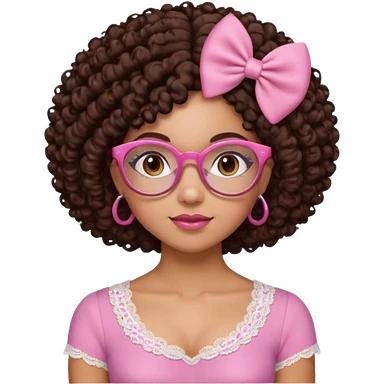 medium kinned afro-latina girl with medium length chocolate brown side part curly hair, small pink bow on the side, with brown glasses, brown eyes, noes piercing, pink and white sweekhart necklined top with lace, round wide-ish nose emoji | AI Emoji Generator