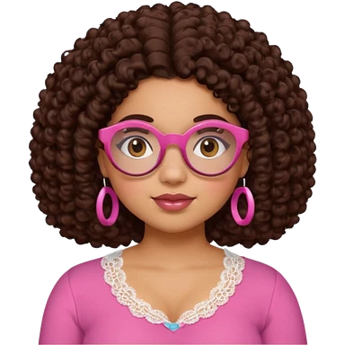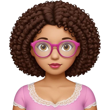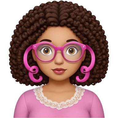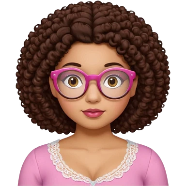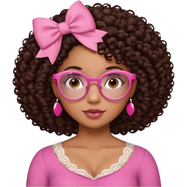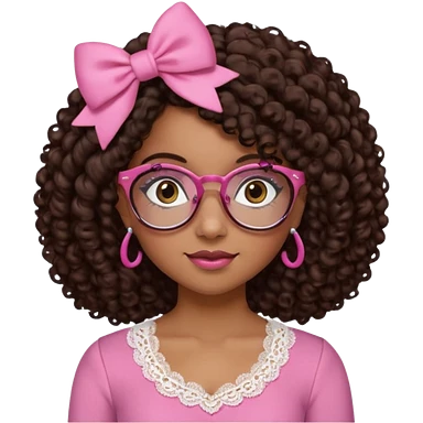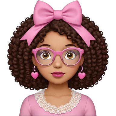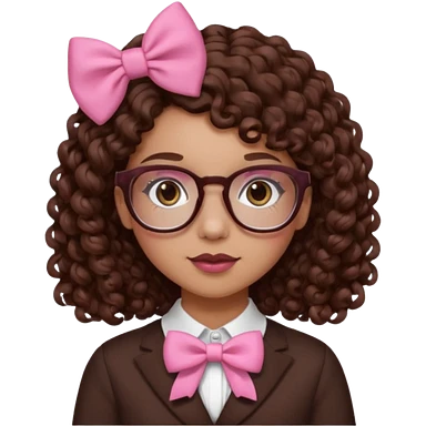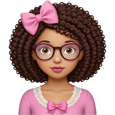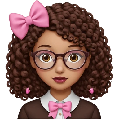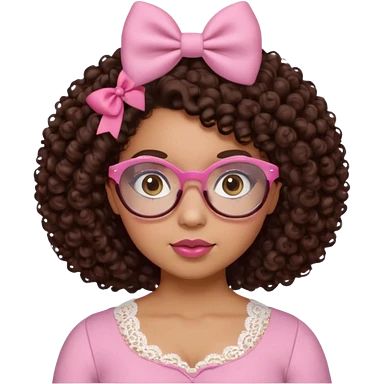 medium-lightskin girl with medium length chocolate brown side part curly hair, pink and white bow on the side, with brown glasses, brown eyes, noes piercing emoji | AI Emoji Generator