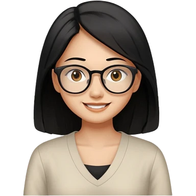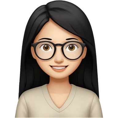 medium tan asian woman with long black hair past middle of back, round brown eyes, white v neck blouse. she has black square frame glasses on and smiling with no teeth emoji