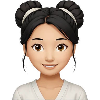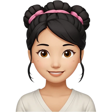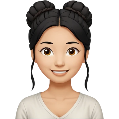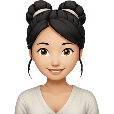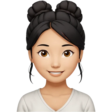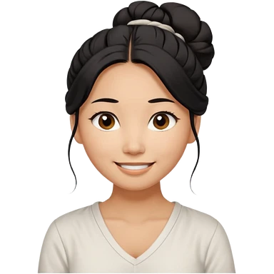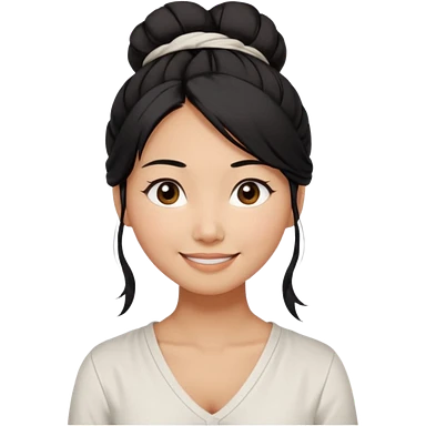 medium tan asian woman with long black hair tied in a high messy bun, round brown eyes, white v neck blouse. shes smiling and friendly. emoji