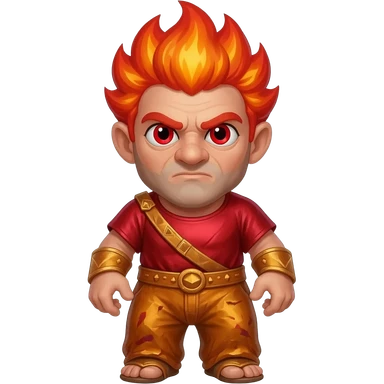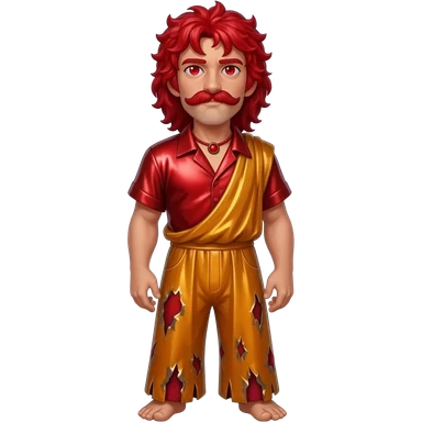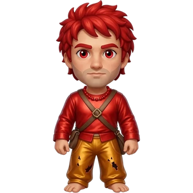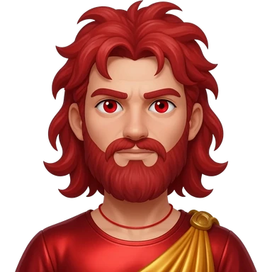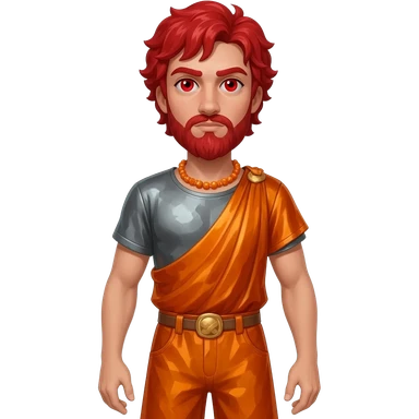 Hephaestus from Greek Mythology with red eyes, red hair, red metallic shirt, burnt orange metallic baggy pants, red necklace emoji