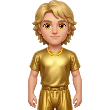 Apollo from Greek Mythology with amber eyes, long blonde hair, gold metallic shirt, gold metallic baggy pants, yellow necklace emoji