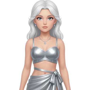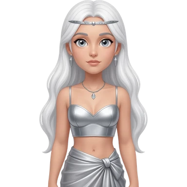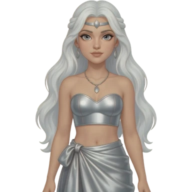 Artemis from Greek Mythology with grey eyes, long white hair, silver metallic sweetheart crop top, silver metallic wrap long skirt, silver necklace and earrings emoji