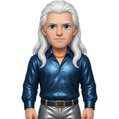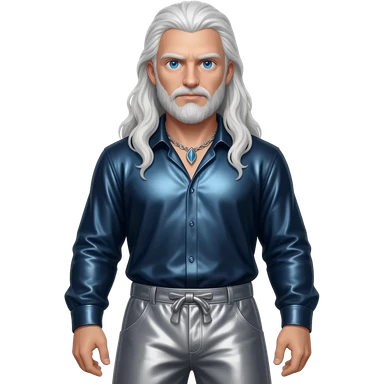 Odin from Norse Mythology with blue eyes, long white hair, dark blue metallic shirt, grey metallic baggy pants, silver necklace emoji