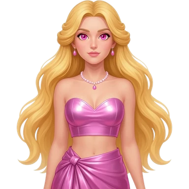 Aphrodite from Greek Mythology with pink eyes, long blonde hair, pink metallic sweetheart crop top, pink metallic wrap long skirt, pink necklace and earrings emoji
