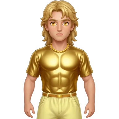Apollo from Greek Mythology with amber eyes, long blonde hair, gold metallic shirt, light yellow metallic baggy pants, yellow necklace emoji