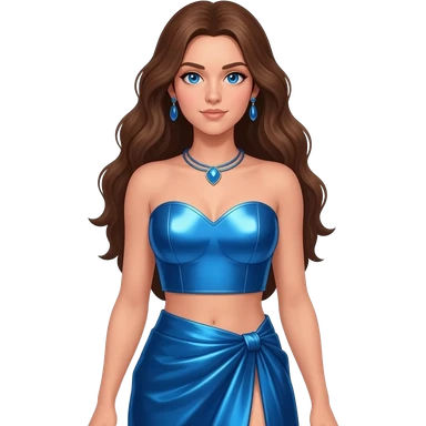 Hera from Greek Mythology with blue eyes, long brown hair, blue metallic sweetheart crop top, blue metallic wrap long skirt, blue necklace and earrings emoji