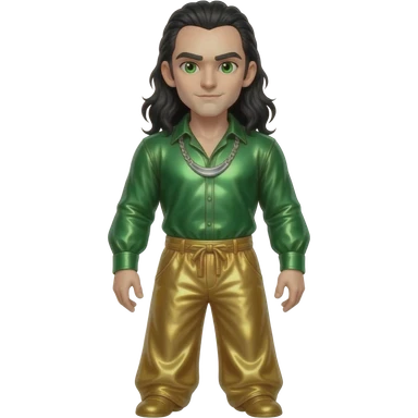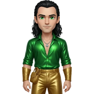 Loki from Norse Mythology with green eyes, long black hair, green metallic shirt, gold metallic baggy pants, silver necklace emoji