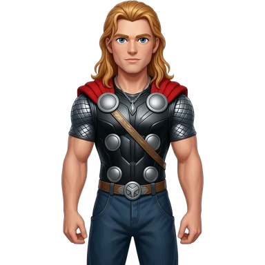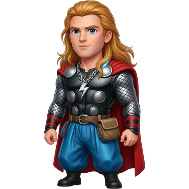 Thor from Norse Mythology with green eyes, long blonde hair, black metallic shirt, blue metallic baggy pants, silver necklace emoji