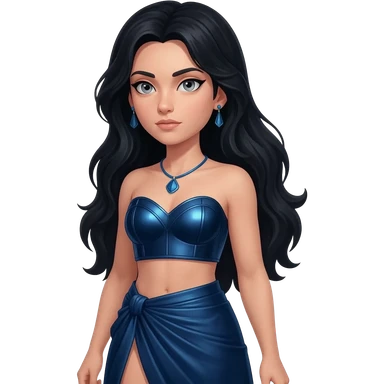 Athena from Greek Mythology with grey eyes, long black hair, dark blue metallic sweetheart crop top, dark blue metallic wrap long skirt, blue necklace and earrings emoji