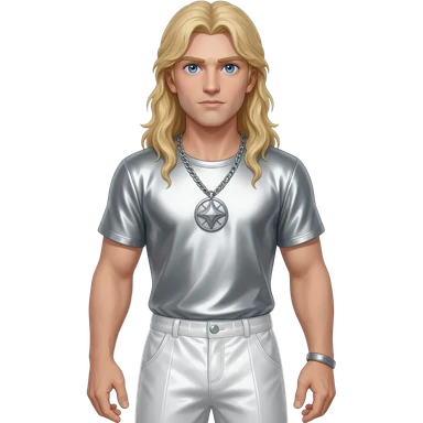 Baldr from Norse Mythology with blue eyes, long blonde hair, silver metallic shirt, white metallic baggy pants, silver necklace emoji