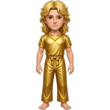 Apollo from Greek Mythology with amber eyes, long blonde hair, gold metallic shirt, ivory metallic baggy pants, yellow necklace emoji