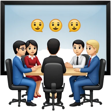 meeting table with 6 people seated two men, both width buzcuts and glases, two blonwimen with long hair, two brownhaired women with long hair and one brown haired woman with short hair emoji